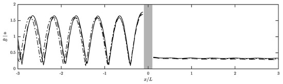 Spatial variation of amplitude ratio, , due to a bottom obstacle above a muddy bed with different thicknesses. Solid lines: (solid bottom). Dashed lines: . Dashed-dotted lines: . Vertical bars indicate the location of the bottom obstacle. In this case, s, m, m, m2/s, kg/m3, m, and m. See Figure 1b for the problem definition.
