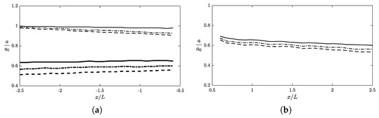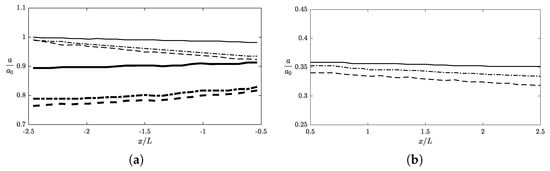 In Figure 9a, we show the decomposed incident waves and reflected waves corresponding to the results with different mud layer thicknesses presented in Figure 8. For the case of a solid bed , the amplitudes decrease only slightly as waves propagate towards or away from the obstacle, with around 2% changes over two wavelengths as shown in the figure. When a viscous fluid bed is considered, by contrast, considerable wave amplitude attenuation is observed for both incident and reflected components. For , the amplitude of incident wave decreases 7.5% over a propagation distance of while the amplitude variation for reflected wave is 15.5%. For a thicker mud with , the attenuation of wave amplitude becomes weaker, dropping to 5.8% and 7.9% for incident and reflected waves, respectively. In Figure 9b, we take a closer look at the corresponding transmitted waves in the region after the obstacle. We observe that for the cases with , , and the changes of amplitudes over distance are, respectively, 2.0%, 7.0% and 5.1%. We reiterate that for waves propagating over a fluid mud bed without any obstacles, the attenuation of wave amplitude over is 7.2% as shown in Figure 6. This implies that for the case of a surface obstacle the incident and transmitted waves experience the same wave damping as if there was no obstacle. The results illustrated in Figure 9 also indicate that, across all wave components, the largest damping rate occurs at , which is in agreement with the existing laboratory study [66] and analytical modeling [68,70] all showing that an extreme wave attenuation rate is possible when the mud layer thickness is about the Stokes boundary layer thickness of mud.