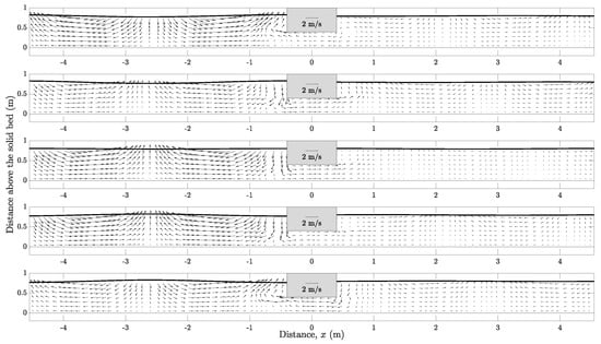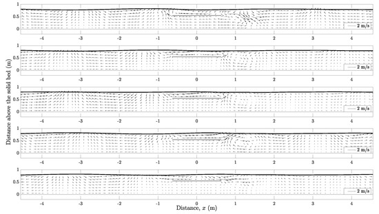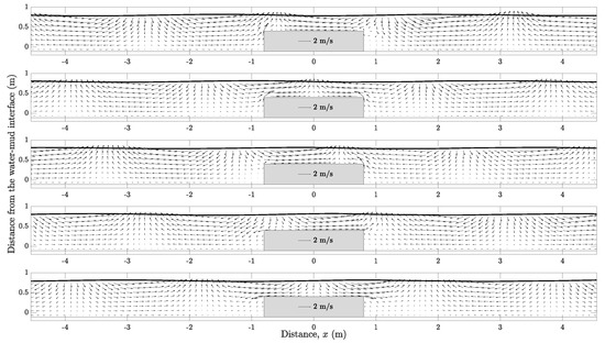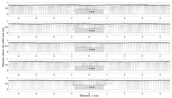 Submerged obstacle on a solid bed : snapshots of velocity field over a wave period at , , , , and (top to bottom). Solid line indicates the free surface. See Figure 18 for the model inputs.