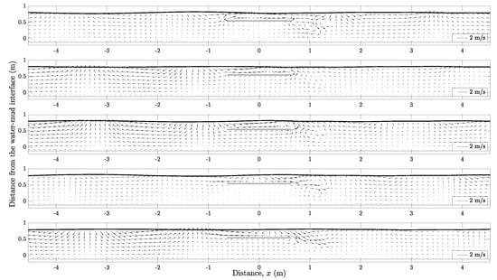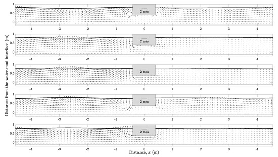 The associated velocity field for the case of a submerged obstacle above a solid bottom is plotted in Figure 20. The figure, which presents the snapshots at several equally spaced time instants within a wave period, reveals large velocity gradients in both horizontal and vertical directions around the leading edge of the obstacle. Furthermore, in the lee of the obstacle a prominent clockwise vortex is formed. The flow pattern shown in Figure 20 is similar to the laboratory observations of waves passing over a bottom obstacle on a solid bed [20,21]. In Figure 21, we present the velocity field with the consideration of a muddy bed with . Comparing with the results shown in Figure 20 for the case of a solid bed, the size of the vortex core is considerably smaller when the effects of viscous fluid mud bed are taken into account. In addition, an obvious phase difference on the formation of the vortex is observed.