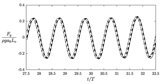 Time histories of dimensionless vertical force acting on the bottom of a surface obstacle. Solid line: (solid bottom). Dashed line: . Dashed-dotted line: . The dimensional force is given in (5). See Figure 8 for other model inputs.