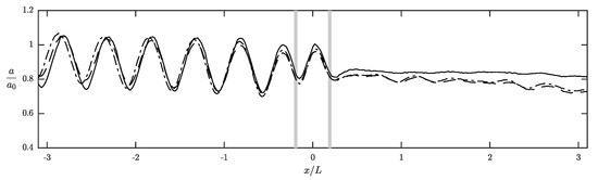 We first consider the case of wave scattering due to a surface obstacle by examining the reflection and transmission coefficients, which are defined as the ratios of reflected wave amplitude and transmitted wave amplitude to the incident wave amplitude, respectively [7]. In order to determine the refection coefficient from our numerical results, in the region before the obstacle it is necessary to decompose the incident waves and the reflected components from the simulated combined waves. Some techniques commonly used for the reflection analysis in physical wave flume testing include the two-point method employing fast Fourier transform to analyze records of wave spectra taken simultaneously at two adjacent stationary wave gauges [77], the N-gauge approach applying three or more stationary wave gauges with least squares optimization to minimize the noise signal for improved accuracy [78,79], and the use of Doppler analysis on free-surface data recorded by one or more continuously moving wave gauges [80]. We note that these methods are based on the assumption that the principle of superposition is applicable. In the present analysis, we adopted a more direct but time-consuming approach by performing additional trivial companion simulations for wave propagation without any obstacles. Hence, under the linear superposition, the reflection due to the obstacle can be readily deduced as