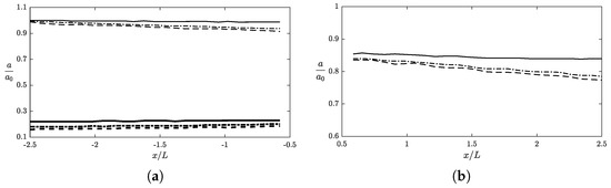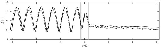 Lastly, we discuss the case of a submerged obstacle as illustrated in Figure 1c with m. For convenient, we consider again an incident wave of s and m in water of depth m. Regarding the properties of viscous fluid mud, m2/s and kg/m3. In addition, three different cases with , , and are examined to evaluate the effects of mud layer thickness. In Figure 18, we plot the spatial variation of dimensionless amplitude, , showing the amplitude attenuation and phase shift caused by the muddy bed and a sudden change in wave amplitude due to the obstacle. Figure 19a shows the decomposed incident and reflected components corresponding to the simulated combined waves presented in Figure 18. For the incident waves, we observe a 2.0%, 7.8%, and 6.4% decrease in wave amplitude over a propagation distance of two wavelengths corresponding to , , and . Similarly, the changes of wave amplitude for the reflected components are comparable at 2.3%, 8.7 %, and 5.7%, respectively. Our results show again a strong damping caused by the bottom fluid med. Moreover, the largest damping rate occurs when . Regarding the transmitted waves presented in Figure 19b, it is shown that the amplitude variation over is significantly higher at 13.1% for , 18.3% for , and 16.6% for . This is very different from the observations of both surface and bottom obstacles presented in Figure 9b and Figure 14b, respectively. In this example, the unexpected large change in wave amplitude, especially over 10% for the case of a solid bottom (), is mainly attributed to the effects of vortex generation due to the shape edges of the obstacle [20,21]. This amplitude variation can not be explained solely as the wave damping by the viscous mud. The behavior can be better understood by examining the velocity field and is discussed in the following.