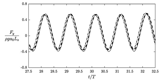Time histories of dimensionless vertical force exerted on a submerged obstacle. Solid line: (solid bottom). Dashed line: . Dashed-dotted line: . See Figure 18 for other model inputs.