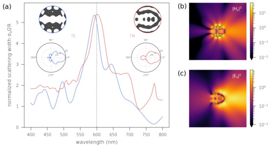 We perform two separate optimizations for each polarization for a fixed wavelength, starting with an initial homogeneous density , and use a filter of radius . Results are displayed in Figure 1: the spectra on panel (a) reveal that the scattering width is enhanced resonantly around the target wavelength of 600 nm for both polarizations. The insets show the resulting intricate topologies obtained after optimization (the light colour is silica whilst the dark is silicon). The norm of the near field is displayed in Figure 1b for TE polarization and Figure 1c for TM polarization, featuring strong forward scattering in both cases. This is confirmed by the radiation patterns (see insets in Figure 1a).
