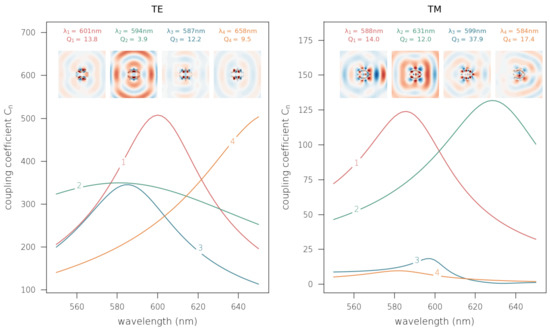 The results of our modal analysis for the optimized nanorods are summarized in Figure 2. For TE polarization, the dominant eigenmode has a resonant wavelength of nm, very close to the target wavelength nm, and a moderate quality factor . The other modes have a smaller coupling strength but still contribute to the scattering behaviour. For TM polarization, we observe a quantitatively equivalent coupling with modes 1 and 2 at the target wavelength, but their resonances are distributed around this central value. The magnitude of other coupling coefficients is small compared to those two modes, although the resonant wavelength for mode 3 is very close to . Furthermore, the field maps (see insets) of modes 1 and 2 clearly show strong forward scattering. This analysis indeed demonstrates that the strong scattering behaviour is due to the simultaneous excitation of several QNMs and allows us to quantify the relative strength of the interaction with each mode.