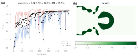 The history of our optimization is plotted in Figure 3a and converges to transmitted efficiencies of around 87% for TE polarization and 87% for TM polarization. Discontinuities in the values as the iteration increases are attributed to a competing effect between the two orthogonal polarizations, but also to the projection, filtering techniques, and underlying optimization algorithm. Nevertheless, the optimized blazed metasurface features an excellent transmission coefficient in the target order, showing the convergence of our algorithm to a local maximum. The optimized layout is displayed in Figure 3b, resulting in an array of almost touching and almost connected silicon nanostructures. We remark that, as in any optimization algorithm requiring an initial guess, the influence of the starting layout may play a significant role in the final result [65]. The high performance exhibited by topology-optimized metasurfaces has been attributed to complex light–matter interactions thanks to a high density of Bloch modes with intermode and intramode coupling [62].