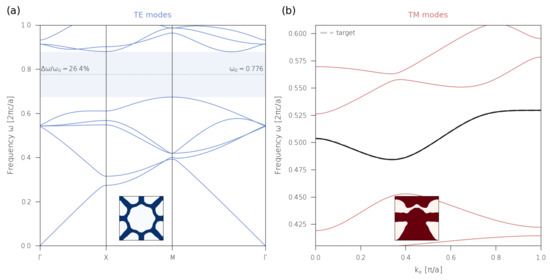 In this instance, we enforce symmetry on the unit cell. The results of this optimization are reported in Figure 5a: we obtain a bandgap centered at with relative width of around of about 26%. The inset shows the dielectric distribution in the unit cell and is in accordance with the simple rules given in Reference [66]: the walls of an optimal centroidal Voronoi tessellation with points.