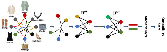 In recent years, online shopping has become more and more important for modern consumers and has greatly promoted the development of the fashion industry. According to Statista, the global online fashion market was worth 533 billion dollars in 2018, and it is predicted to grow to 825 billion dollars by 2022. In 2018, apparel accounted for 65 percent of the market, followed by footwear (25 percent) and bags and accessories (10 percent). Additionally, there are several interactive fashion community sites that allow customers to create their own styles using the image data on the site. The typical industrial sites are Polyvore (https://www.polyvore.com) (accessed on 20 August 2022), Farfetch (https://www.farfetch.cn) (accessed on 20 August 2022) and Dappei (https:/dappei.cn) (accessed on 20 August 2022). However, not everyone is a natural fashion designer. Therefore, it is of great significance to establish a reasonable and effective outfit compatibility prediction model by analyzing the masses of fashion items and outfits.