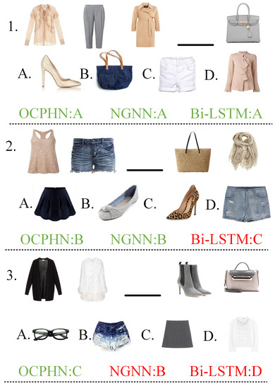 In Figure 5, we selected several outfits randomly as test cases for the FITB task and compared our model with a strong baseline (i.e., the NGNN and Bi-LSTM). From the first example, it can be seen that all models inferred that the query outfit lacked a pair of shoes and chose the correct answer. In example 2, all the three models chose the right category, while Bi-LSTM chose the wrong answer. This might be because Bi-LSTM only considers simple category information and cannot distinguish fine-grained category information (i.e., the differences between sandals and pumps). From example 3, it can be seen that only OCPHN chose the item most compatible with the query outfit. This may be attributed to our model being able to model the overall outfit and better simulate the complex relationships between the items in the outfit. These examples prove the superiority of our model in FITB tasks.