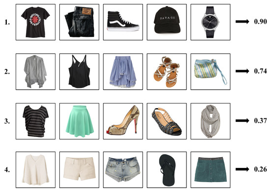 In Figure 6, we visualized several test examples randomly in the compatibility prediction task to show our model’s performance. From the figure, it can be seen that OCPHN can estimate whether a set of fashionable items will form a compatible outfit. For instance, the items in the first example had complementary styles and similar colors, so they had a higher compatibility score. In the second example, although the categories of the items were complementary, the color of each item was different, so the compatibility score was not too high. The low compatibility scores in the third and fourth examples were mainly due to the repeated category of items. It is obvious that there were two pairs of shoes in the third example, and the last one contained three dresses.