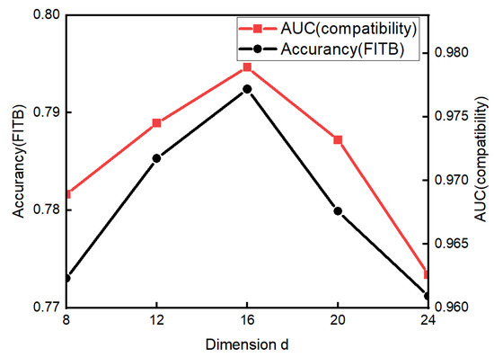 To investigate whether OCPHN can benefit from different style space dimensions, we varied the model size. In particular, we varied the model size from 8 to 24 with an interval of 4. The performance of our model in different dimensions is shown in Figure 7. It can be seen from Figure 7 that when the dimension d was 16, the FITB accuracy and compatibility (expressed as the AUC) performance reached their highest points. When d exceeded 16, the performance dropped rapidly, which shows that few parameters are needed to represent the node status.