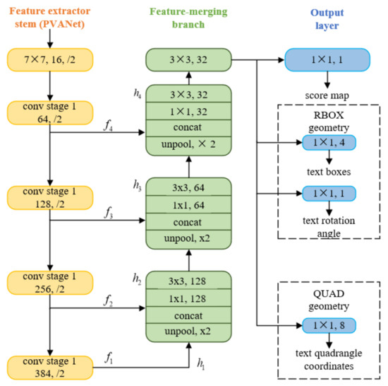 The output layer is obtained using the convolution operation with many 1×1 convolution kernels. Then, 32-channel feature maps are projected to generate 1-channel fractional and multi-channel geometry feature maps. The geometry output can be rectangular or quadrilateral (see Table 1).