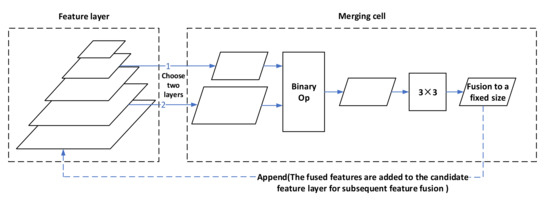 Multiple cross-scale connections of FPN networks can constitute a huge search space. In the search space, the FPN network is composed of many merging cells (MC), which are merged with feature representations. The fusion unit connects and fuses the feature maps from two different levels of feature layers as a feature output. The unit structure constitutes the meta-structure of the FPN network. The component feature combination of the fusion unit constitutes the search space of the algorithm. The structure of the fusion unit is depicted in Figure 5.