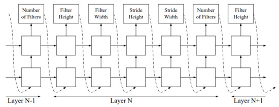 The structure and internal connections of the neural network are specified using a variable-length string. Therefore, the RNN can be used to generate variable-length network structures. The predicted network contains only convolutional layers, whose hyperparameters are generated using the RNN. These hyperparameters include the following: the height, width, and number of convolution kernels, and the height and width of the sliding stride of the convolution kernel. As depicted in Figure 8, the output predicted by each SoftMax function in the RNN is used as the next input.
