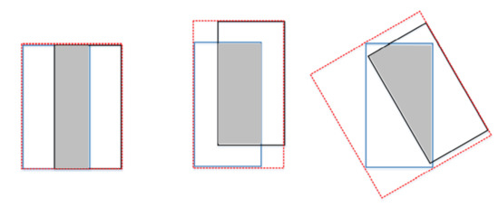 There are two problems with using the IoU directly as the loss function. First, when the two boxes do not intersect, can be obtained by definition. In this case, the contact ratio of the two boxes cannot be reflected. Second, when , model training cannot be performed because there is no gradient backhaul. As depicted in Figure 9, when the IoU is the same, the detection results of the prediction boxes may also be different. The text detection result on the far right is the worst.