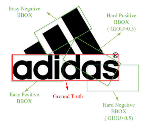 As depicted in Figure 12, the BBOX required to calculate the loss value is divided into two types: positive and negative. When the GIoU between the BBOX and ground truth (GT) is greater than a threshold value, the BBOX is a positive BBOX. When GIoU is less than the threshold value, the BBOX is a negative BBOX.
