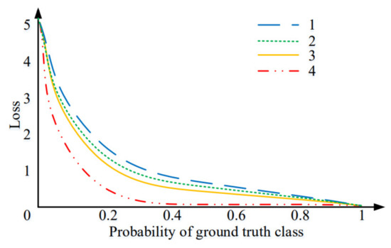 As depicted in Figure 13, when the example is misclassified and is small, modulation factor is close to 1 and the loss is not affected. When , the factor becomes 0 and the loss on well-classified examples is weighted. Furthermore, the focus parameter z smoothly adjusts the weights of simple examples. When , FL is equal to CE. As the parameter increases, the effect of the modulation factor also increases. For the third curve , FL works the best. The modulation factor reduces the loss contribution in the simple example. Furthermore, the range of the sample reception low loss is extended. Finally, the b-balanced variant of FL is used.