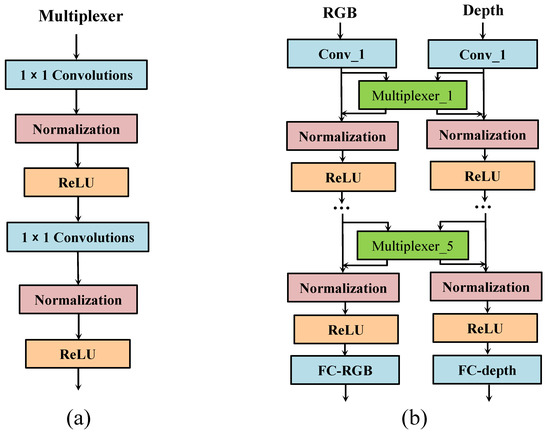 In terms of network architecture design, ResNet is selected as the basic network based on the highly modular residual unit. The proposed ILD-ConvNet is divided into two paths to process the input RGB and depth information flow characteristics, respectively. High-level interactive learning is conducted through the multiplexer module, as shown in Figure 2.