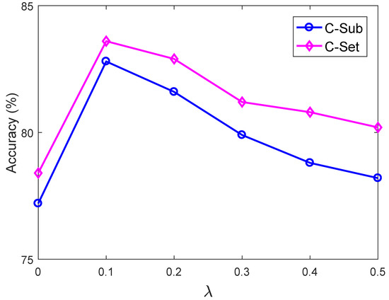 The hyper parameter controls the weights of the previous convolution layers in ILD-ConvNet. Adjusting should improve the recognition performance of the proposed ILD-ConvNet. We first roughly get the range of through analyzing the contribution of different item in Equations (6) and (7). The higher forces the RGB and depth streams to obtain more interactive features from different modalities. However, more noise will be introduced at the same time, which will affect the recognition performance of the proposed network model. Therefore, we should select the optimal through verifying the results in practice.
