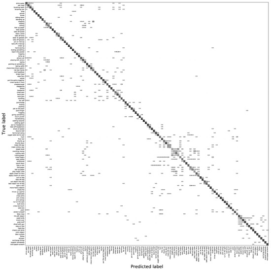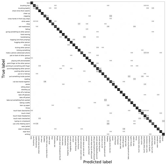 Figure 4 and Figure 5 shows the confusion matrix under the two evaluation protocols. It can be seen that the designed ILD-ConvNet can effectively identify most of the actions, but some refined actions, such as “make an OK sign” and “snap fingers”. On the C-Sub test protocol, highly similar actions of human–object interaction are easy to be confused, such as “put on glasses” and “take off glasses”, “reading” and “writing”. In addition, it is difficult to effectively distinguish actions with similar behavior trajectories, such as “rub two hands” and “clasping”.