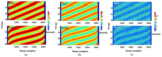 The linear frequency-modulated (LFM) waveform is widely used in radar systems, such as the synthetic aperture radar [1], the millimetre wave radar [2,3], and the weather radar [4]. The linear time-frequency relationship of the LFM signal allows the output signal from the mixing receiver to be a low-pass signal that does not require complex matching-filter operations to produce pulse-compressed signal-processing gains, thus making the radar system simple and achieving low complexity in terms of its signal processing operations. In addition, the LFM signal is easily generated using a voltage-controlled oscillator, which allows for flexible settings of the signal period and tuning-frequency parameters.