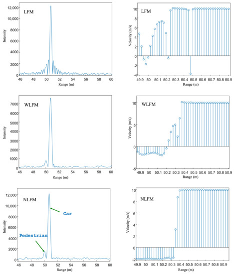 Again, the proposed NLFM radar exhibits the most robust performance for measuring the low RCS targets under the interferences of high sidelobes. In practice, the detection of pedestrian is very important in improving the safety of pedestrian and traffic. However, the pedestrians are of low RCS targets and are usually around vehicular targets with high RCS. The above representative experiment demonstrates the advantages of the proposed NLFM radar.