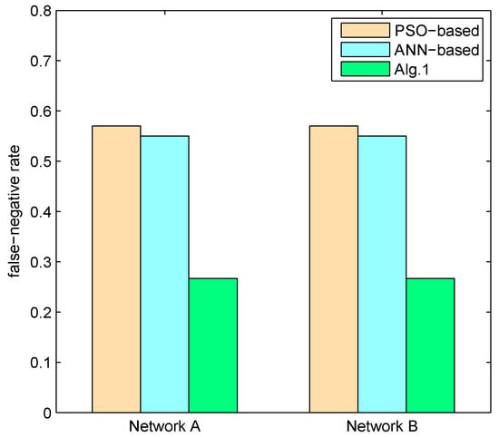 Comparison of false-negative rate with respect to different : (a) shows the false-negative rate for network A (), (b) shows the false-negative rate for network A (), (c) shows the false-negative rate for network B (), and (d) shows the false-negative rate for network B ().