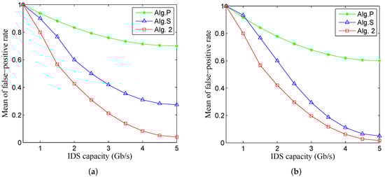 Figure 2a,b show the mean of false-negative rates with respect to the IDS capacities achieved by the three schemes. In particular, Figure 2a,b are the results for network A and network B, respectively. We can see that our proposed Algorithm 2 outperforms the other two schemes in both network settings. Algorithm 2 has the fastest convergence rate to achieve the lowest capture-failure rate.