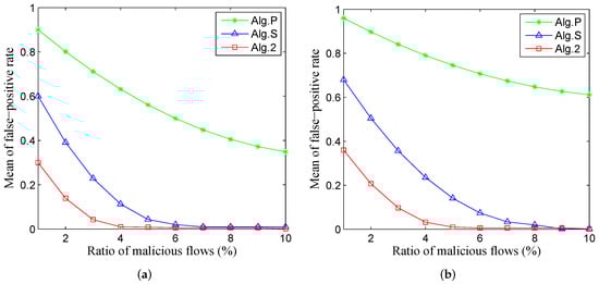 Next, we show the mean false-negative rate with respect to the ratio of malicious packets. As shown in Figure 3a,b, the proposed Algorithm 2 has the fastest convergence rate among the three approaches. In practice, the proposed Algorithm 2 may require 20% or fewer iterations than Alg. S, while Alg. P with a much slower convergence is left out of the competition.