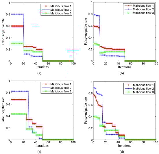 As shown in Figure 4a–d, in each iteration, the false-negative rates for three flows are calculated, and is updated in accordance with Equation (19). As seen in Figure 4a,b, after several updates to , the proposed IDS model can detect the majority of malicious packets in network A. As the model iterates, the accuracy rises. Additionally, in the initial few iterations, the convergence is faster with a higher . The same results apply to network B, as shown in Figure 4c,d. The accuracy of anomalous traffic detection will therefore be improved by updating in the traffic sampling process. If the malicious packet rate is high enough with an optimized , the missing rate might be nearly 0. Additionally, the findings from Figure 4a–d show that the convergence rate declines with a smaller . Additionally, the fact that approaches the exact value in continuous feedback is what causes the convergence.