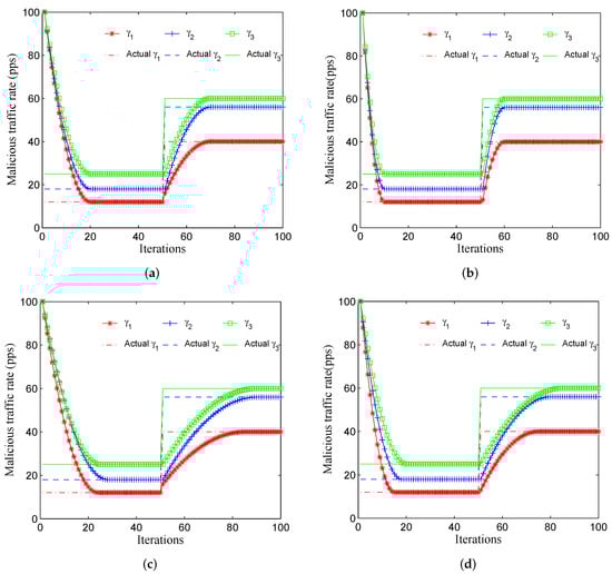The change of is further demonstrated in Figure 5a–d. As it demonstrates, soon approaches the actual value. After the 50th iteration, we update the actual value of to show that our suggested IDS model can adjust to rapid network changes.