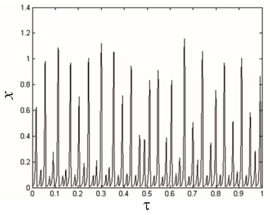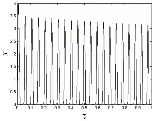 The evolution of the concentrations of intermediate species can exhibit a simple or complex periodic behavior and, in some situations, it can become chaotic (Figure 1, Figure 2 and Figure 3). For small values of the kf parameter, the concentration of x(τ) shows a simple periodic oscillation. This behavior changes into a periodic oscillation with different numbers of peaks by increasing the value of the kf, and chaotic behavior is obtained for kf = 3.9 × 10−4. After this stage, the oscillating behavior with multiple peaks is resumed.