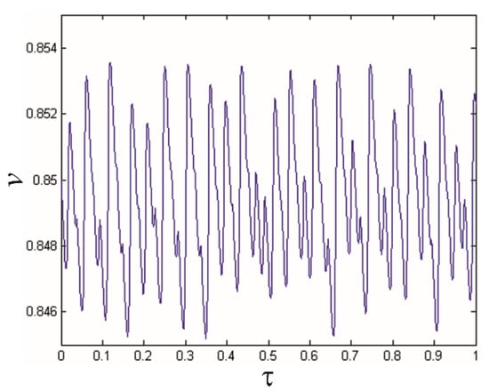 The evolution of the v(τ) concentration at high flux (α = 3000/9; β = 6/23; C = 0.001; A = 0.14 mol; M = 0.3 mol; H = 0.26 mol and kf = 6.18 × 10−4) and initial values: x(0) = 0.045; z(0) = 0.9; v(0) = 0.85.