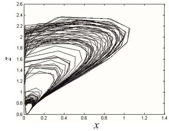 Bidimensional attractor (x, z) with open cycle obtained for low flux in Györgyi–Field system: α = 6000/9; β = 8/23; A = 0.1 mol; C = 8.33 × 10−4 mol; M = 0.25 mol; H = 0.26 mol and kf = 3.9 × 10−4.