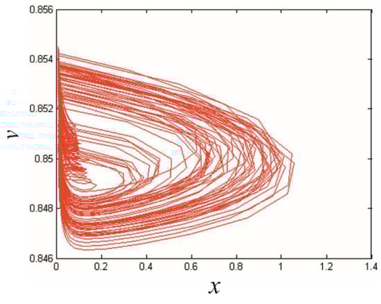 Bidimensional attractor (x, v) with open cycle obtained for low flux in dynamic Györgyi–Field system: α = 6000/9; β = 8/23; A = 0.1 mol; C = 8.33 × 10−4 mol; M = 0.25 mol; H = 0.26 mol and kf = 3.9 × 10−4.