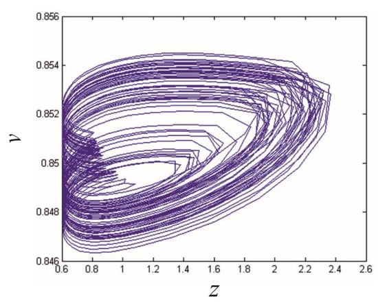 Bidimensional attractor (z, v) with open cycle obtained for low flux in Györgyi–Field system: α = 6000/9; β = 8/23; A = 0.1 mol; C = 8.33 × 10−4 mol; M = 0.25 mol; H = 0.26 mol and kf = 3.9 × 10−4.