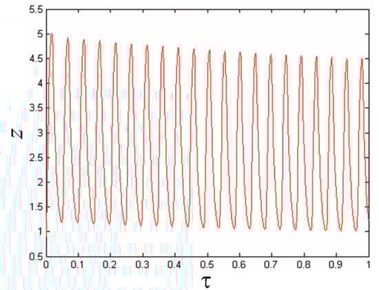 The evolution of the z(τ) concentration at high flux (α = 3000/9; β = 6/23; C = 0.001; A = 0,14 mol; M = 0.3 mol; H = 0.26 mol and kf = 6.18 × 10−4) and initial values: x(0) = 0.045; z(0) = 0.9; v(0) = 0.85.