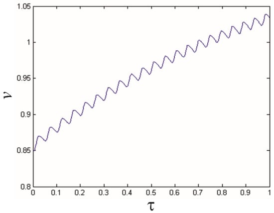 The evolution of the v(τ) concentration at low flux (α = 6000/9; β = 8/23; A = 0.1 mol; C = 8.33 × 10−4 mol; M = 0.25 mol; H = 0.26 mol and kf = 3.9 × 10−4) and initial values: x(0) = 0.045, z(0) = 0.9 and v(0) = 0.85.