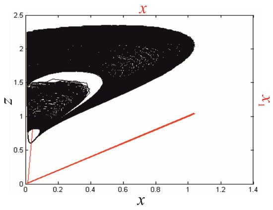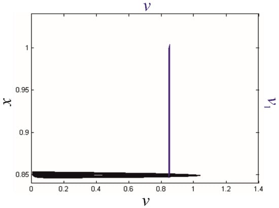 Comparing the phase portraits of masters [(x, z), (z, v), (v, x)] and the phase portraits of master–slave systems [(x, x1), (z, z1), (v, v1)] we observe that the last phase portraits become straight lines (Figure 14, Figure 15 and Figure 16), which is proof that synchronization is achieved.