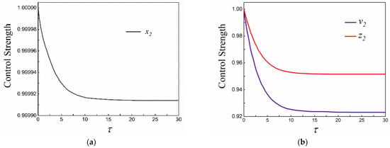 The evolution of the control strengths in time: (a) The variation of the x2(τ) control strength; (b) the stabilization values of the v2(τ) and z2(τ).