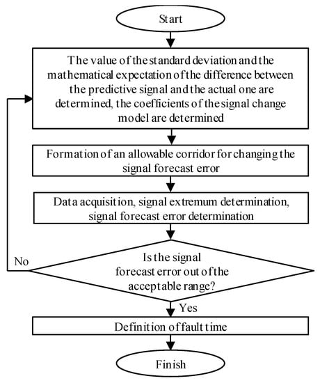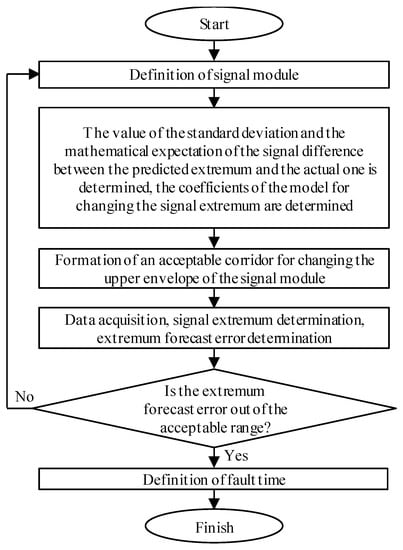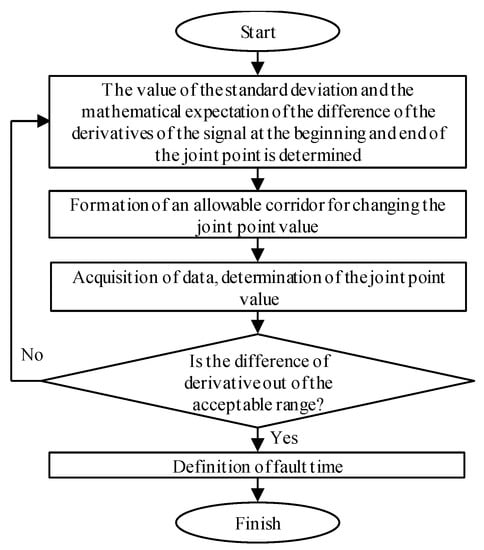 In the learning stage, the algorithm estimates the difference between derivatives of the signal from the first and second windows. Then, the mean and standard deviation of the resultant series are calculated. Assuming that forecast error follows a normal distribution, the algorithm forms a 3-σ corridor based on the rule of three sigmas. The algorithm estimates the value at the joint point after the new data are acquired. If the value is out of the acceptable range, the algorithm detects the disturbance inception.