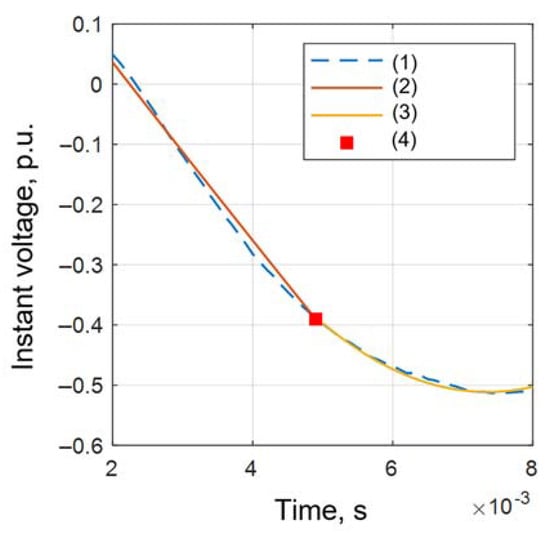 The second-order approximation is used to estimate the disturbance time in instantaneous values of sine current and voltage. Figure 4 describes an example of the joint point modulation, (1)—measurements, (2)—first window, (3)—second window, and (4)—joint point.