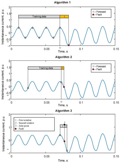 Algorithm 1 makes it possible to find disturbance time within the first extremum of a transient, which leads to lower accuracy in comparison with algorithms 2 and 3. Algorithms 2 and 3 show similar accuracy. From the point of view of emergency control, one of the basic requirements is low time-response of signal digital processing. At the same time, the full-time delay of the algorithm is a sum of the algorithm delay and the delay of the apparatus part. For algorithms 1 and 2, the orange rectangle highlights the forecast stage and the gray one highlights the stage of acquisition of the coefficients of the changing signal model. The red circle highlights a point of disturbance inception. Figure 5 describes the first and second windows, marked as gray rectangles, forming the base for the joint point, the red circle highlights a point of disturbance inception. For algorithm 3 a time delay corresponds to the size of the first window. Algorithm 1 has the highest algorithm time delay and the lowest accuracy, which makes it difficult to use this emergency control. Algorithms 2 and 3 have similar accuracy in finding a time of disturbance inception. The time delay of algorithm 3 could be significantly reduced by using the express method of approximation with a second-order polynomial [45].
