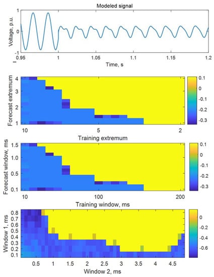 Figure 6 describes an example of settings for each algorithm for the modeled signal. The colored line shows the forecast error of disturbance inception estimation, the first sub-plot describes the actual signal, the second one—results after tuning algorithm 1, the third—results after tuning algorithm 2, and the fourth—results after tuning algorithm 3. The color in Figure 6 shows the values of the error in determining the disturbance time. Algorithm settings are selected by determining the range of acceptable error values for determining the disturbance time. The abscissa and ordinate axes of the subplots 2–4 of Figure 6 show the variable settings of the developed algorithms.