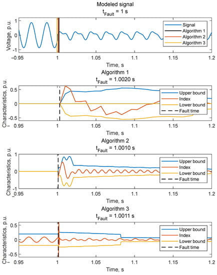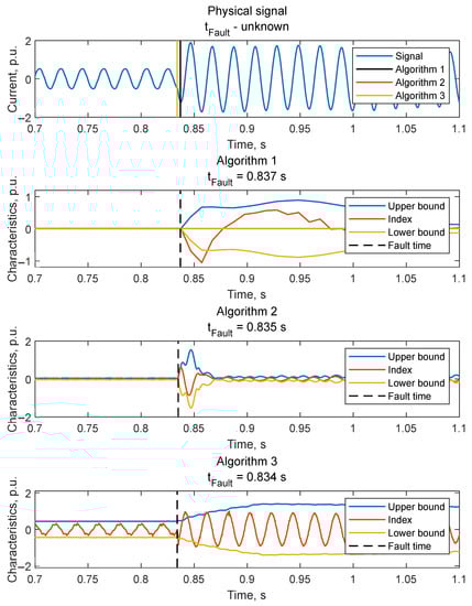 In the case of the physical signal test, a transient record was used. It was obtained from an emergency event recorder installed on one of the real power system facilities. The calculated values of the disturbance inception time were compared with the reference method that uses the discrete Wavelet transform described in [39]. For a physical signal, algorithm 3 demonstrates the smallest deviation from the reference value.