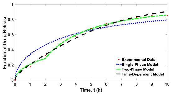 Employing the growth parameter determined above, the fractional drug release data are further fitted to the controlled drug release models; single-phase model, Equation (12), two-phase model, Equation (18), and time-dependent model, Equation (23). The results for all three controlled drug release models are compared.