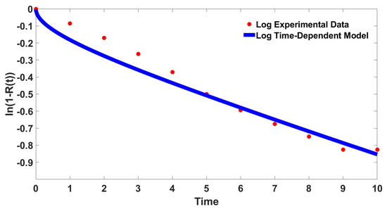 This numerical test has shown that the proposed time dependent model is able to represent the experimental data even after the chosen transformation. However, unlike most of the previous study, our proposed time-dependent model cannot be written in linear form after the logarithmic transformation [28,29,30]. Hence, it is the best to perform the curve fitting using the original equation for this time dependent model.
