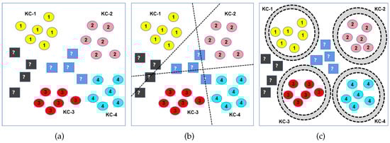 Most current intelligent fault diagnosis models are DL methods based on the closed set assumption (CSA), which assumes that the fault types in the training and test data share the same class features. However, the methods under this assumption have superior fault detection performance in the field of fault diagnosis. Moreover, since the training set cannot contain all fault types, this assumption is not valid in practical industrial applications as it is often unrealistic or even impossible to ensure that the training set will contain all possible fault types. Firstly, manually labeling all fault types during the training phase is expensive can be error-prone. Secondly, the process of vibration signal collection is time-consuming, and it is difficult to collect all types of fault data in a limited time. Moreover, some types of fault may not even occur during training data collection. DL models based on the CSA will misclassify it into the fault type defined by the training set when a previously unseen type of fault appears in the test set. In order to solve this problem, it is necessary to develop an open set assumption (OSA)-based method for fault diagnosis that cannot only correctly classify the known classes (KCs) but can also identify the unknown class (UC). Figure 1 provides a comparison between CSA and OSA classification. Figure 1a shows the distribution of the original dataset, including KC (labeled as 1, 2, 3, 4) and UC (labeled as ?). KC appears in both the training and testing phases, while UC only appears in the testing phase. As shown in Figure 1b,c, dotted lines and circles represent decision boundaries, respectively. The classifier classifies all points in the decision boundary into one class to divide different classes. Figure 1b shows that the traditional CSA classification method only considers the empirical risk and cannot deal with the open space risk. The classifier misclassifies the new category as KC, i.e., the existence of UC will introduce errors in classification decision making, so it is particularly important to limit the risk of open space. In contrast, as shown in Figure 1c, the decision boundaries of the OSA classification method is able to limit the range of KC(1, 2, 3, 4) and exclude UC(?). Hence, the UC(?) can be rejected instead of being misclassified as KC(1, 2, 3, 4). The OSA classification method combines empirical risk and open space risk which considers the space beyond the reasonable support of KCs. To improve the rejection ability of UC, it is necessary to further limit the open space risk and ensure that the open space risk is minimized.