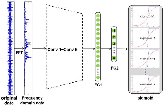 The architecture of OS-CNN is shown in Figure 2, which contains six convolution layers and pooling layers. The FC2 layer represents K class nodes, and the sigmoid layer represents K sigmoid functions corresponding to K KCs. To suppress the influence of high-frequency noise on classification accuracy in bearing signals, the OS-CNN structure proposed in the paper is similar to the WDCNN method proposed by Zhang et al. [38]. The first layer uses a wide convolution kernel. Specifically, the size of the first convolution kernel is , and the size of the remaining kernels is . The pooling type is maxpooling, and the activation function is ReLU. In order to normalize the data, a Batch Normalization (BN) layer is added after each convolution layer. Two fully connected (FC) layers are used behind the convolution layer, and the node in the second fully connected layer (FC2) corresponds to the fault type in the training set. The last layer of the model is inspired by the deep open classification (DOC) method [16], which builds a 1-vs.-rest layer containing K sigmoid functions for K KCs. The specific method seeks to establish K sigmoid functions for K KCs and then converts each KC into a probability distribution in the range of [0,1] to calculate the uncertainty measure for each class.